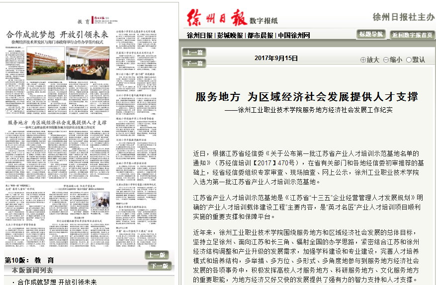 近日,根据江苏省经信委《关于公布第一批江苏省产业人才培训示范基地名单的通知》(苏经信培训【2017】470号),在省有关部门和各地经信委初审推荐的基础上,经省经信委组织专家审查、现场抽查、网上公示,徐州工业职业技术学院入选为第一批江苏省产业人才培训示范基地。