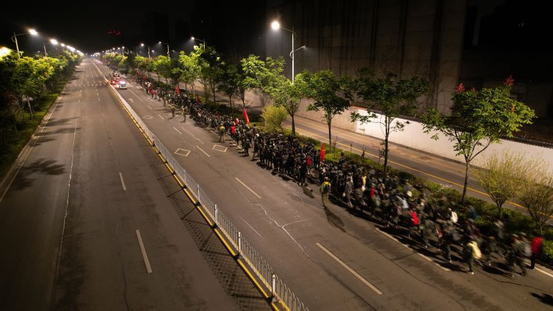 凌晨1点,军训团1-7营共3645名2023级新生按照指定地点迅速完成集结,鲍桂楠向军训团发出行进令。各营高举营、连旗,踏着整齐步伐、高喊口号,从学校东门出发,穿过九里山隧道,沿九里山古战场南岸荆马河路一路向东挺进,经中山北路,转向沈孟大道进入驻徐某部营区,在营区休整并参观相关武器装备,然后原路返回,全程约16公里,共历时5小时。