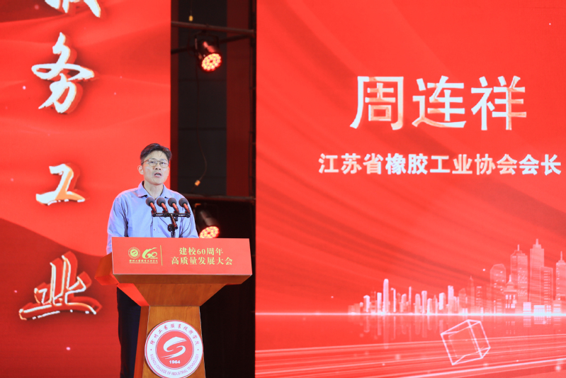 校友代表、江苏省橡胶工业协会会长周连祥致辞。他向母校60周年华诞献上诚挚热烈的祝贺,感谢母校的培育和恩师们的教诲。他表示,从车间操作工到技术员,再到后来创办企业,每一步的成长都离不开母校赋予的刻苦学习、踏实做事的品质。母校“求真、求实、求精、求新”的校训一直激励着自己克服困难、脚踏实地、追求卓越。