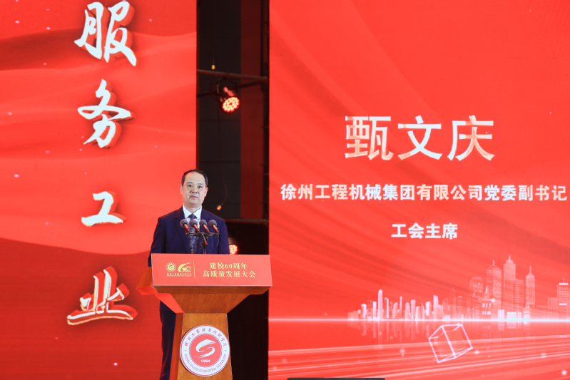 徐州工程机械集团有限公司党委副书记、工会主席甄文庆在致辞中称赞了徐州工业职业技术学院办校60年间为国家和地方产业发展做出的卓越的贡献。他指出,近年来校企双方开展深入合作,探索出了菜单式现代学徒制育人和“234”现场工程师人才培养模式,培养了大批服务先进制造所需的高素质技术技能人才。他强调,校企双方在未来将进一步加强合作,共同培养更多具有国际视野、高技术水平的海外服务工程师和海外当地化人才,为建设制造强国、教育强国,推进中国式现代化持续走在前、做示范,勇挑大梁、多作贡献。