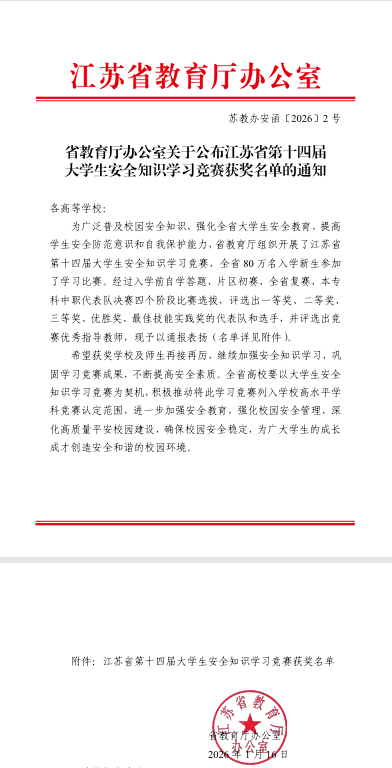 近日,由江苏省教育厅主办、江苏省高等教育学会保卫研究会承办的江苏省第十四届大学生安全知识竞赛决赛落下帷幕。我校由何宇豪、李柯燃、周思彤三名同学组成的代表队荣获省赛三等奖,保卫处魏宇川、贾翔翔两位老师获评“优秀指导教师”。