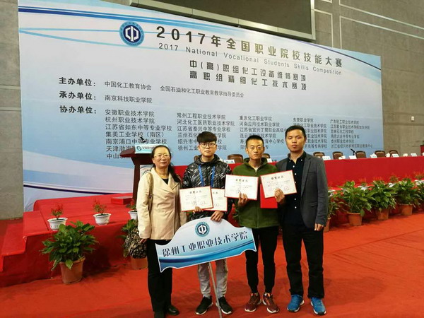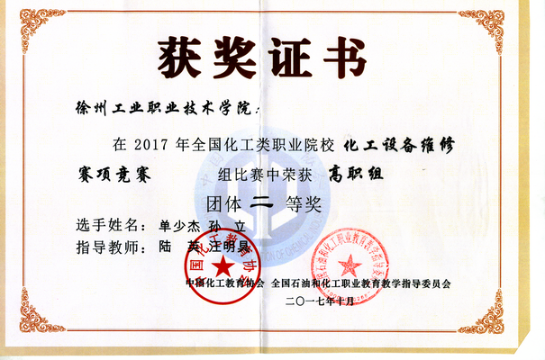 10月23日至25日,由全国石油和化工职业教育教学指导委员会主办的“2017年全国化工类职业院校化工设备维修赛项竞赛”在南京科技职业学院落下帷幕。来自全国23支代表队46名选手参加了比赛。我校机电工程学院生产过程自动化151班单少杰、机械制造与自动化162班孙立两位同学组成代表队参赛,并最终取得团体二等奖,同时两位同学都荣获了“镶配件制作”个人单项二等奖和“化工设备维修专业基础”个人单项三等奖。