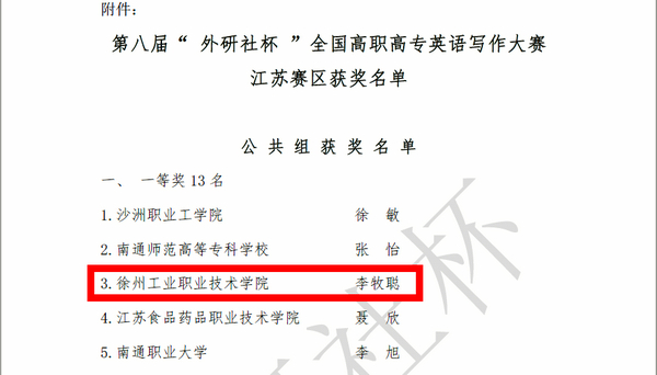 1028日,第八届“外研社杯”全国高职高专英语写作大赛(江苏赛区)在南京举行;我校高分子161 李牧聪同学(米芙铮老师指导)以全省第3名的成绩荣获公共英语组一等奖,将于12月份代表江苏省赴北京参加决赛。此外,机械制造与自动化151班刘玲玲同学(韩善化老师指导)荣获三等奖,位列全省49名。