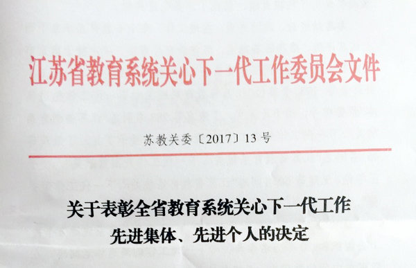 近日,江苏省教育系统关心下一代工作委员会发布《关于表彰全省教育系统关心下一代工作先进集体、先进个人的决定》(苏教关委【2017】13号),我校关工委荣获先进集体,现任常务副主任王健强荣获“突出贡献奖”。这是我校关工委自成立以来第二次获此殊荣,标志着我校关工委各项工作已经进入全省教育系统,特别是高校关工委工作的先进行列。