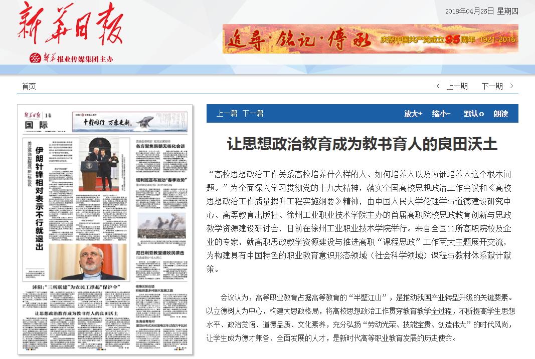 “高校思想政治工作关系高校培养什么样的人、如何培养人以及为谁培养人这个根本问题。”为全面深入学习贯彻党的十九大精神,落实全国高校思想政治工作会议和《高校思想政治工作质量提升工程实施纲要》精神,由中国人民大学伦理学与道德建设研究中心、高等教育出版社、徐州工业职业技术学院主办的首届高职院校思政教育创新与思政教学资源建设研讨会,日前在徐州工业职业技术学院举行。来自全国11所高职院校及企业的专家,就高职思政教学资源建设与推进高职“课程思政”工作两大主题展开交流,为构建具有中国特色的职业教育意识形态领域(社会科学领域)课程与教材体系献计献策。