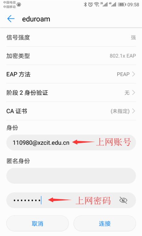 注意1:在身份栏输入的校园网账号需要携带我校的域名(@xzcit.edu.cn)。例如:校园网账号为110980,则在身份栏输入110980@xzcit.edu.cn。