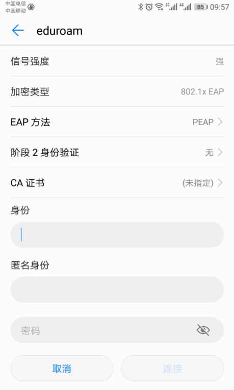 步骤二:链接eduroam,出现如下认证界面: