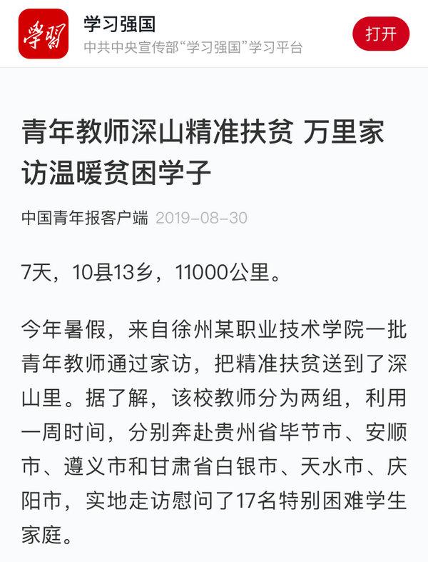 今年暑假,来自徐州工业职业技术学院一批青年教师通过家访,把精准扶贫送到了深山里。据了解,该校教师分为两组,利用一周时间,分别奔赴贵州省毕节市、安顺市、遵义市和甘肃省白银市、天水市、庆阳市,实地走访慰问了17名特别困难学生家庭。