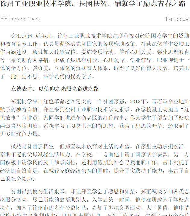 近年来,徐州工业职业技术学院高度重视对经济困难学生的资助和教育培养工作,认真贯彻落实党和国家的各项资助政策,持续深化学生资助工作内涵建设,通过加大政策宣传、实施专项行动、传递心理关爱、强化思想教育等一系资助育人举措,形成了集思想引导、心理疏导、学业辅导、职业规划于一体的全方位、多维度、立体化的资助育人体系,取得了良好的育人成效,培养出了一批自强不息、品学兼优的优秀学子。