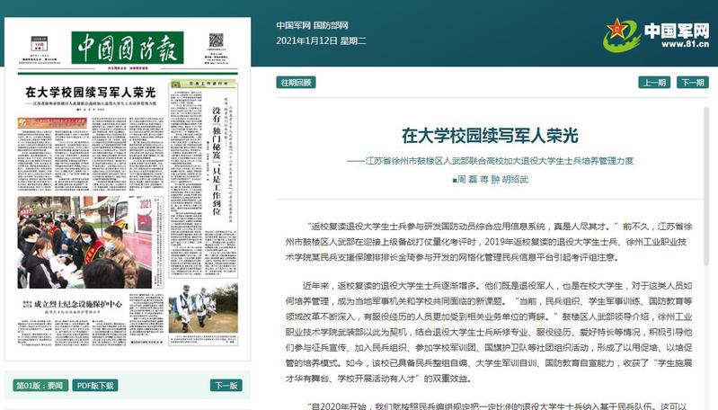 近年来,返校复读的退役大学生士兵逐渐增多。他们既是退役军人,也是在校大学生,对于这类人员如何培养管理,成为当地军事机关和学校共同面临的新课题。“当前,民兵组织、学生军事训练、国防教育等领域改革不断深入,有服役经历的人员更加受到相关业务单位的青睐。”鼓楼区人武部领导介绍,徐州工业职业技术学院武装部以此为契机,结合退役大学生士兵所修专业、服役经历、爱好特长等情况,积极引导他们参与征兵宣传、加入民兵组织、参加学校军训团、国旗护卫队等社团组织活动,形成了以用促培、以培促管的培养模式。如今,该校已具备民兵整组自编、大学生军训自训、国防教育自宣能力,收获了“学生施展才华有舞台、学校开展活动有人才”的双重效益。