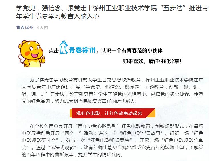 为了将党史学习教育有机融入学生日常思想政治教育,徐州工业职业技术学院在广大团员青年中广泛组织开展“学党史、强信念、跟党走”主题教育,创新“观、讲、唱、诵、走”五步法,教育引导青年学生了解党的光辉历史、感悟党的初心使命、传承党的红色基因,努力成为堪当民族复兴重任的时代新人。