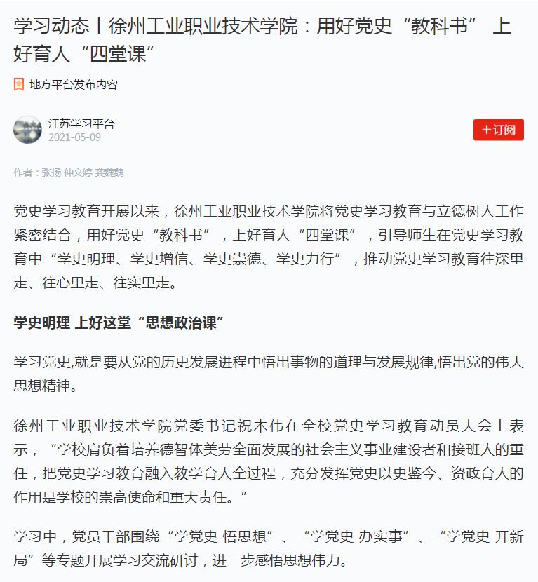 党史学习教育开展以来,徐州工业职业技术学院将党史学习教育与立德树人工作紧密结合,用好党史“教科书”,上好育人“四堂课”,引导师生在党史学习教育中“学史明理、学史增信、学史崇德、学史力行”,推动党史学习教育往深里走、往心里走、往实里走。