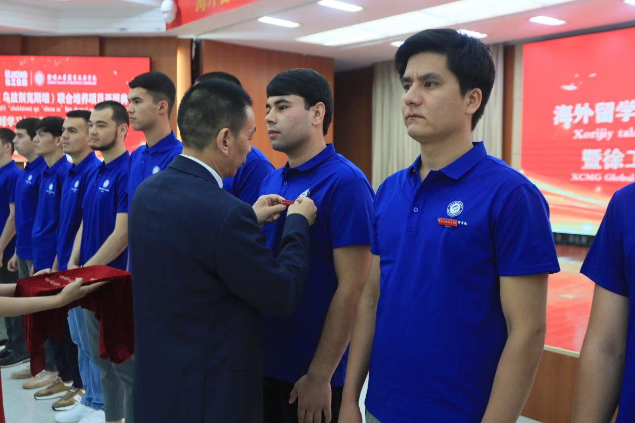 交汇点讯(记者 张扬 通讯员 唐梦)6月5日,徐州工业职业技术学院校长鲍桂楠将一枚校徽别在乌兹别克斯坦留学生胸前,学校“求真、求实、求精、求新”的校训,将跨越天山山脉,最终融入徐工在乌兹别克斯坦的生产线。这一刻,徐州这座“中国工程机械之都”的职教基因,正式注入中亚产业腹地。