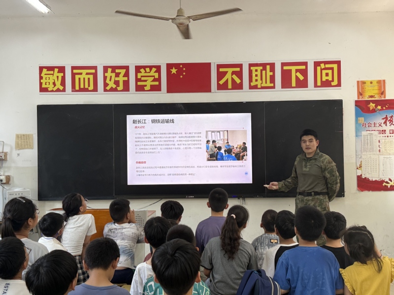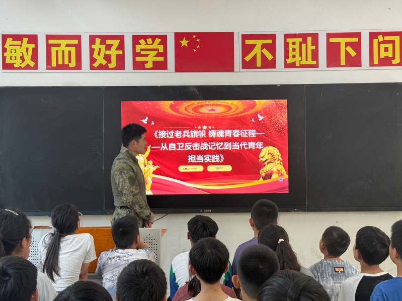 实践队员们深知,老兵精神的传承不能止步于课堂,更要走向更广阔的天地,点燃更多年轻的心灵。带着这份沉甸甸的责任与火热的激情,队员们利用暑期返乡契机,主动将实践成果转化为生动的思政宣讲,开启了一场场感人至深的“双向奔赴”。实践队员、退役大学生士兵徐同锴率先行动。他回到家乡江苏省连云港市赣榆区金桥双语学校,以《接过老兵旗帜铸魂青春征程——从自卫反击战记忆到当代青年担当》为题,为小学生们带来了一堂别开生面的思政课。他结合自身军旅经历,深情讲述了赵长江爷爷在枪林弹雨中驾驶汽车保障运输的惊险故事,以及吴作连爷爷对青年一代“勤奋学习、报效国家”的殷切期望。徐同锴将老兵们不畏牺牲、忠诚报国的精神,与新时代小学生的日常学习、品德修养相结合,引导孩子们思考“红领巾”的责任与担当。互动环节,孩子们纷纷举起小手,表示要向老兵爷爷学习,做勇敢、爱国的好少年。这堂特殊的思政课,在孩子们心中悄然播下了红色的种子。