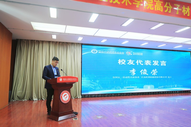 合作企业代表、广东新劲力精密机械有限公司董事长范群分享了校企合作的实践感悟,并对学校培养的高素质人才给予高度评价,期待以产业学院为载体深化合作。优秀校友代表、全国五一劳动奖章获得者、江苏托普轮胎股份有限公司总工程师李俊荣深情回望求学岁月:“母校的‘橡胶工艺实训车间’让我打下扎实功底,如今主导的轮胎配方创新技术,正受益于当年‘求真、求实、求精、求新’的校训滋养”,用自身成长历程诠释了专业育人的坚实成效。