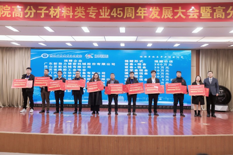 在战略合作与成果发布环节,一系列务实举措彰显合作深度与发展远见:校长鲍桂楠与范群董事长共同为“新劲力产业学院”揭牌,标志着校企合作迈入共建共享新阶段;学校与江苏江昕科技、广东新劲力等企业签订复合型技术技能人才培养协议,筑牢人才供需桥梁;全国石油和化工职业教育教学指导委员会主任于红军发布《高分子行业学习成果认证标准》,为行业人才发展搭建了“立交桥”;公布20家捐赠单位名单并颁发证书,感谢社会各界对教育事业的鼎力支持。